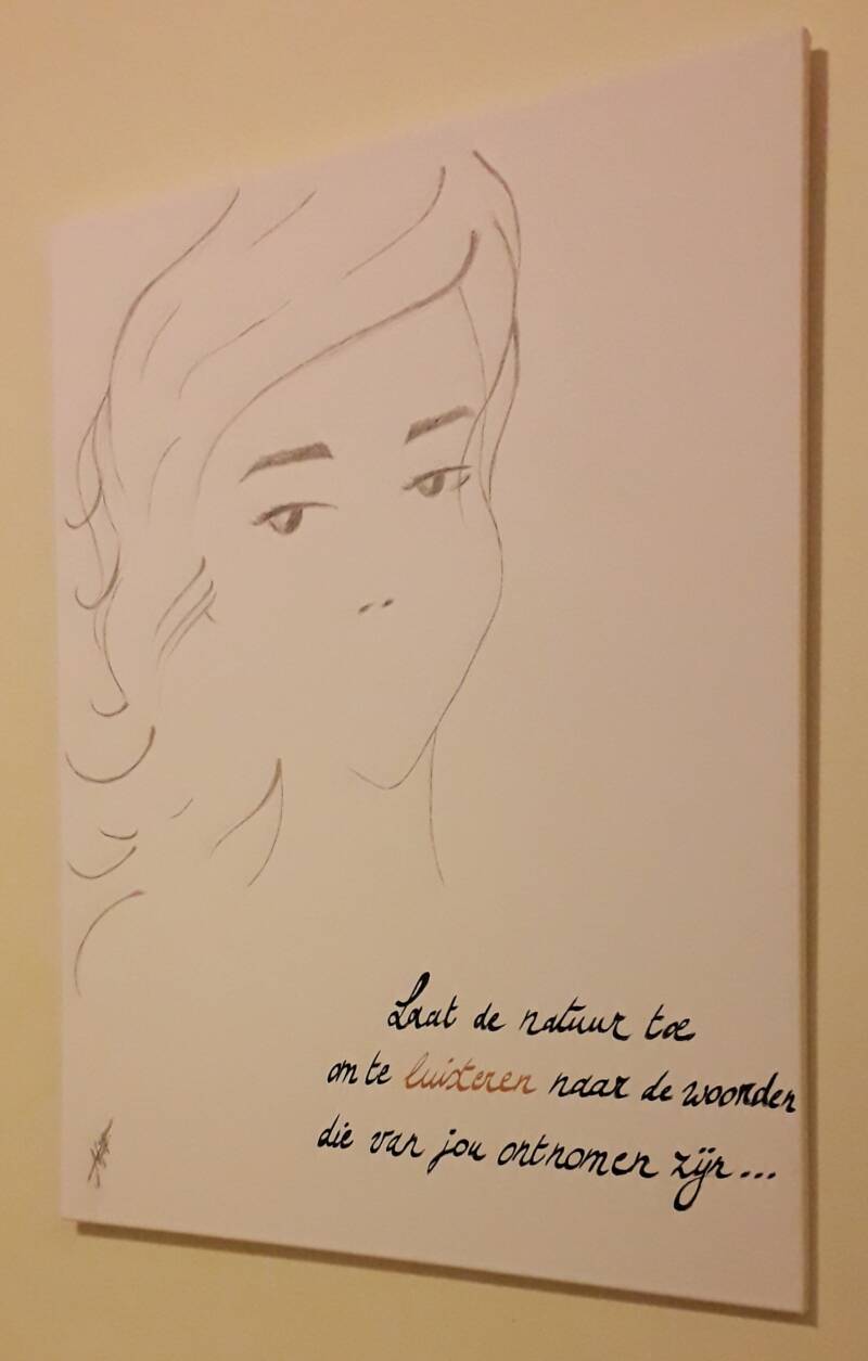 The phrase on this canvas is in Flemish. The canvas shows ceased emotional expressions of an individual enforced by another individual, people in direct medium or a situation(s).